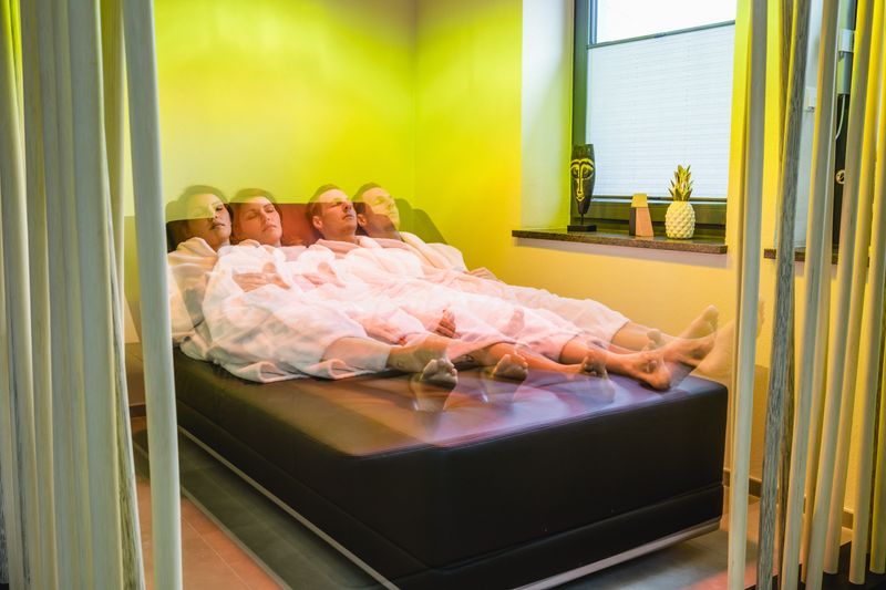 Schon nach wenigen Sekunden verspürt Ihr Körper ein wohliges Gefühl und Sie werden nicht nur den Alltag vergessen, sondern auch die Bewegung der Liege nicht mehr wahrnehmen. Stattdessen sorgt die Pendelfrequenz dafür, dass Körper und Geist vollkommen zur Ruhe kommen. Auch wenn Sie in dieser Zeit nicht tief schlafen, genügen bereits 20 Minuten, um tiefenentspannt wieder aufzuwachen. Die Besonnungseinrichtung "Sonnenwiese" regt parallel dazu mit wohltuenden Wärmesstrahlen die Kollagenbildung und damit den Regenerationsprozess der Haut an. Die Haut wird dadurch glatter und straffer.