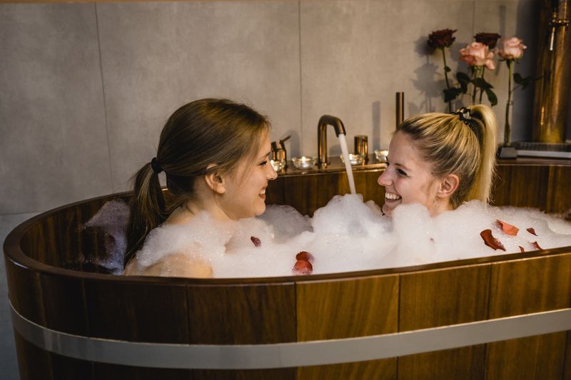 Schaumig, blumig und romantisch wird's in unserem Rosenblütenbad. Die Königin der Blumen verströmt ihren unbeschreiblichen Duft im ganzen Raum. Dies wirkt sich auf Psyche uns Wohlbefinden aus. Nach nur wenigen Minuten finden Sie in märchenhafter Atmosphäre im warmen Wasser tiefe Entspannung. Dazu servieren wir Ihnen jeweils 1 Glas Sekt.